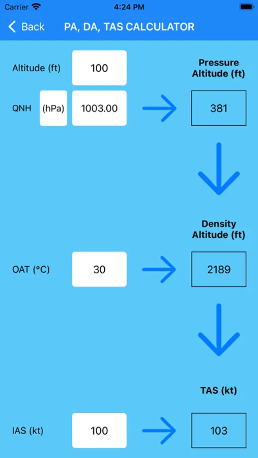 - Allows the user to input height, temperature and IAS and see their effect on the PA, DA and TAS