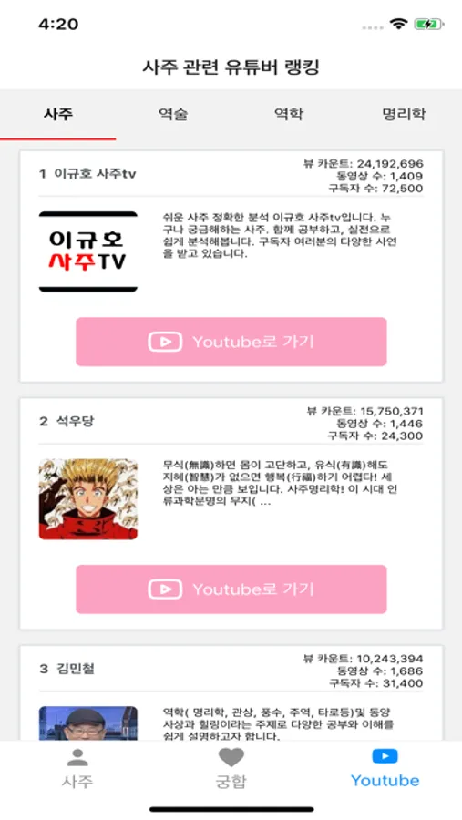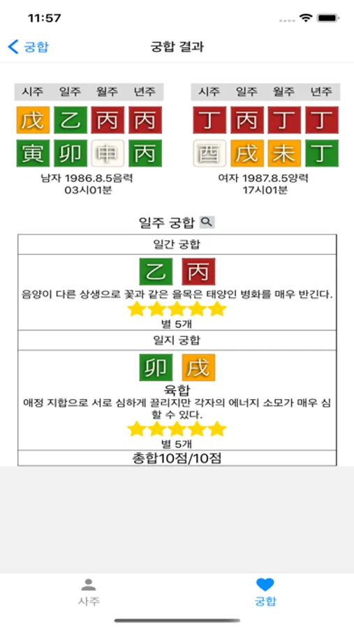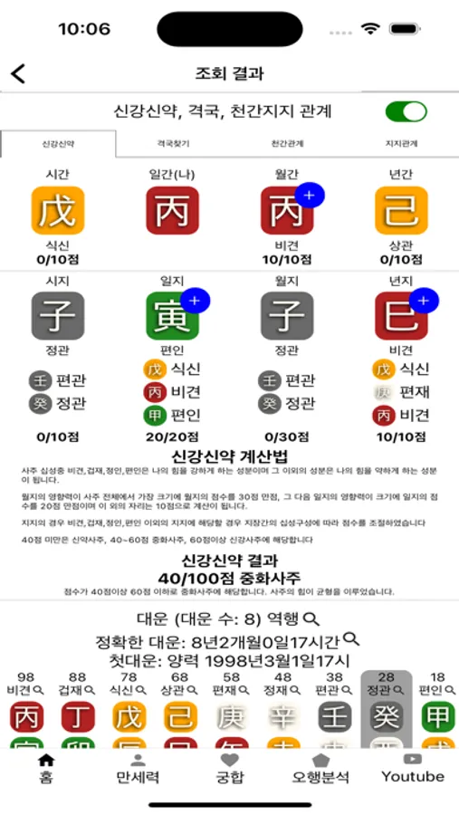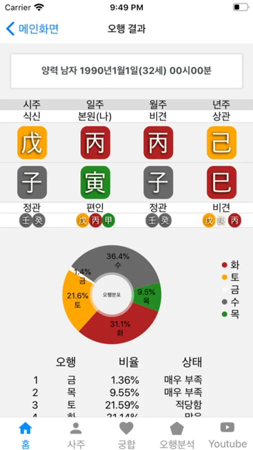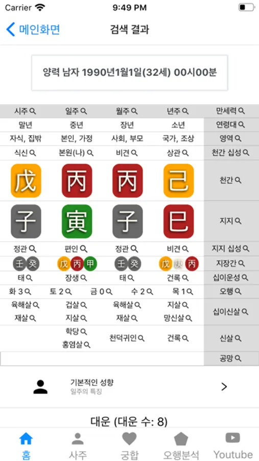 간단하게 사주를 검색할 수 있으며, 대운, 세운, 월운, 오행 개수 등을 확인할 수 있습니다.