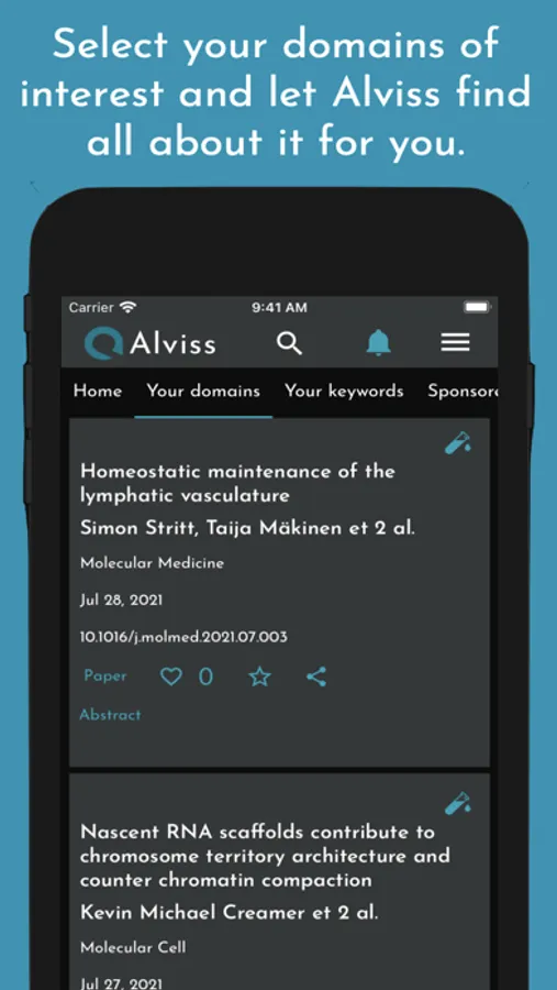 The App displays recently published scientific publications in an easily customizable fashion. Alviss covers many disciplines including medicine, biology, economics, computer science, astronomy, engineering and many more.