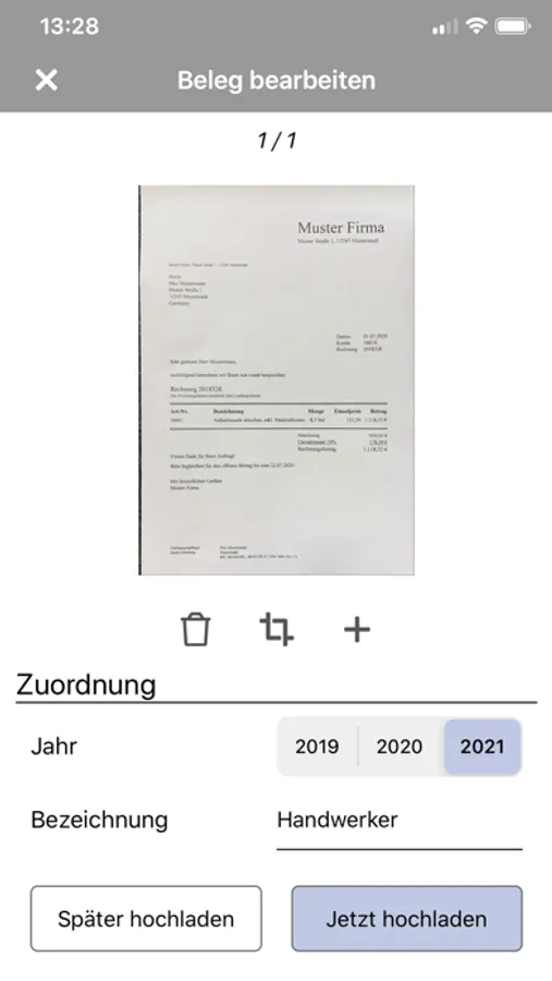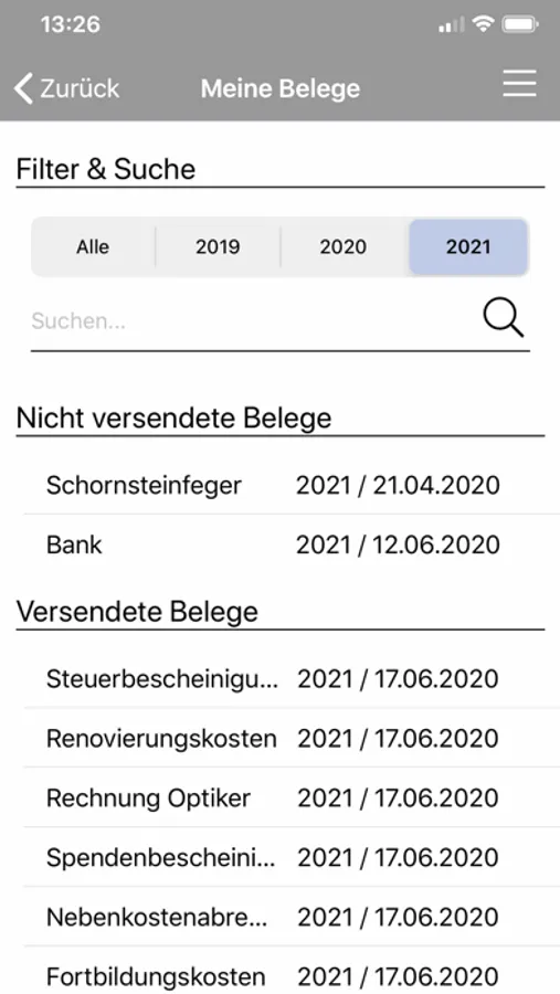 Darüber hinaus bietet die App eine Übersicht Deiner versendeten und nicht versendeten Belege mit jahresspezifischer Filterfunktion und einer Volltextsuche.