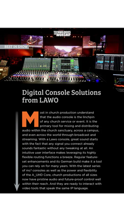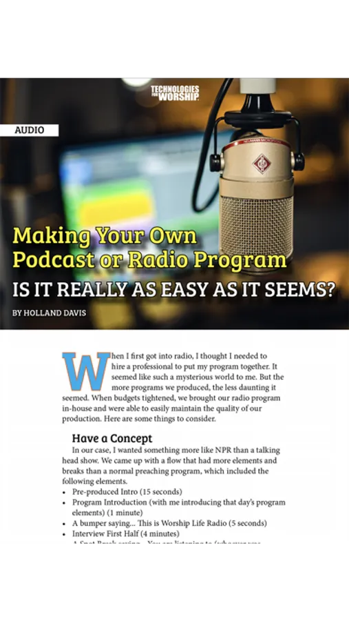 This monthly resource focuses on educating houses of worship on a variety of AVL tech, from Audio to StreamingTechnologies for Worship Magazine.