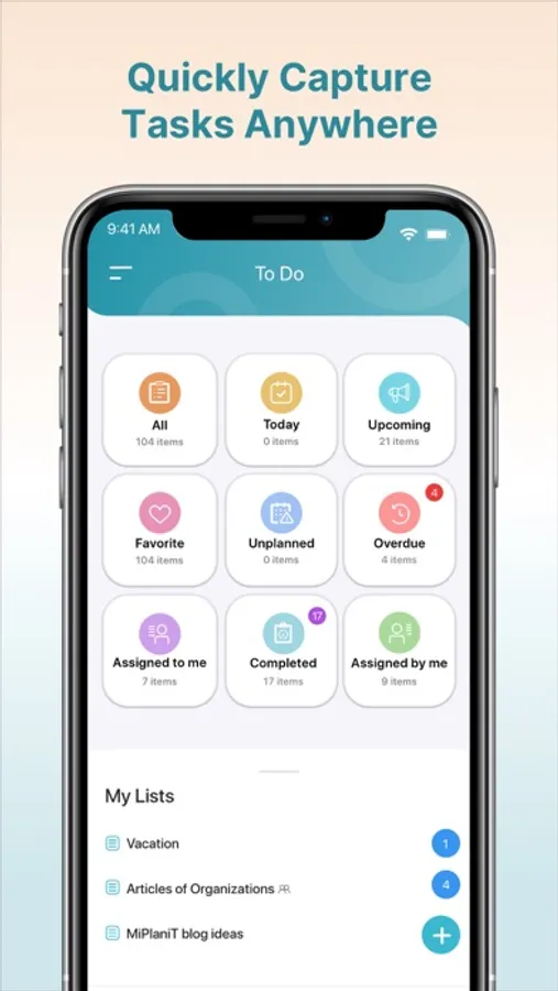 Ability to create lists, share lists, create to do's, share to do's. You can create sub tasks for your to do's or attach pictures and provide all the text detail and dates for each that you need. There is a dashboard that has quick links to All, Today Upcoming, Favorite, UnPlanned, Overdue, Assigned to Me, Completed, and Assigned by Me for you to easily find the To Do that matters to you.