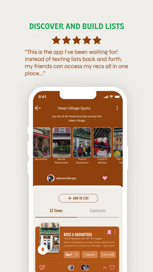 Create customizable lists of your top picks, so you can easily track what you want to watch, where you want to go, and more. Save all your favorites in one place, and share them with your friends so everyone can keep track of the shows or places you want to hit up next.