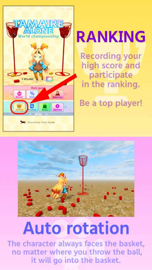 You can record your high score and list your nickname on the ranking list. Aim for a high score and become a world-class ball thrower!