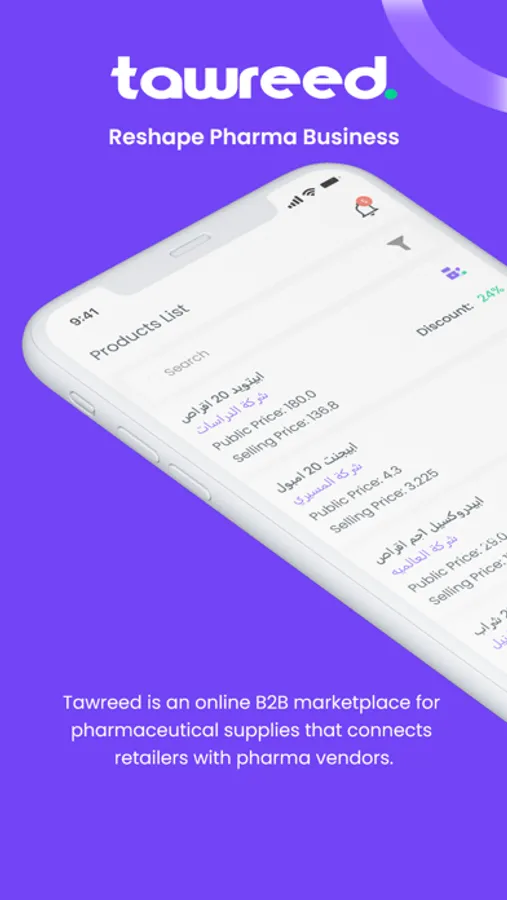 Tawreed is an online B2B marketplace for pharmaceutical supplies that connects pharmacies with pharma vendors, and provides required technology and infrastructure to enable this engagement in an efficient, secure, and cost effective way.