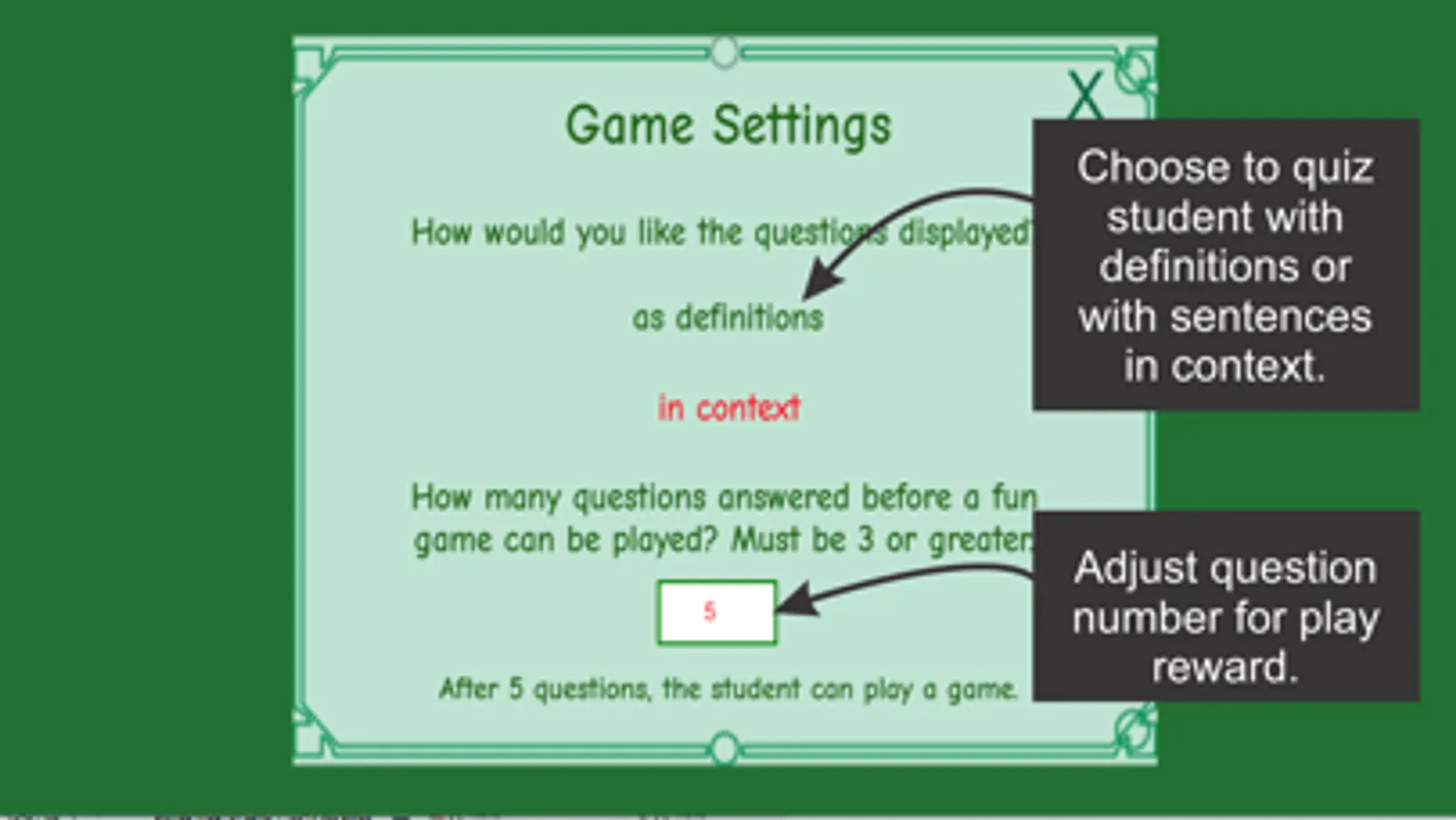 This app allows you to choose two methods of play; context - choosing from two words to fill in a blank in a sentence, and choosing the word for the given definition. After a chosen number of correctly answered questions, your student can choose from one of four fun play activities.