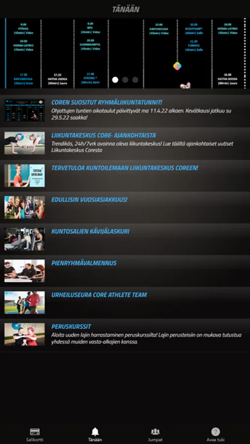 Olit sitten jo Liikuntakeskus Coren jäsen tai vasta sellaiseksi haluava, mobiilisovelluksemme on käyttöliittymäsi meidän palveluihimme. Voit sen avulla aloittaa kuntoilut meillä, käyttää mobiilisalikorttia, varata ja kirjautua ryhmäliikuntatunneille, viestiä asiakaspalvelumme kanssa ja paljon muuta!