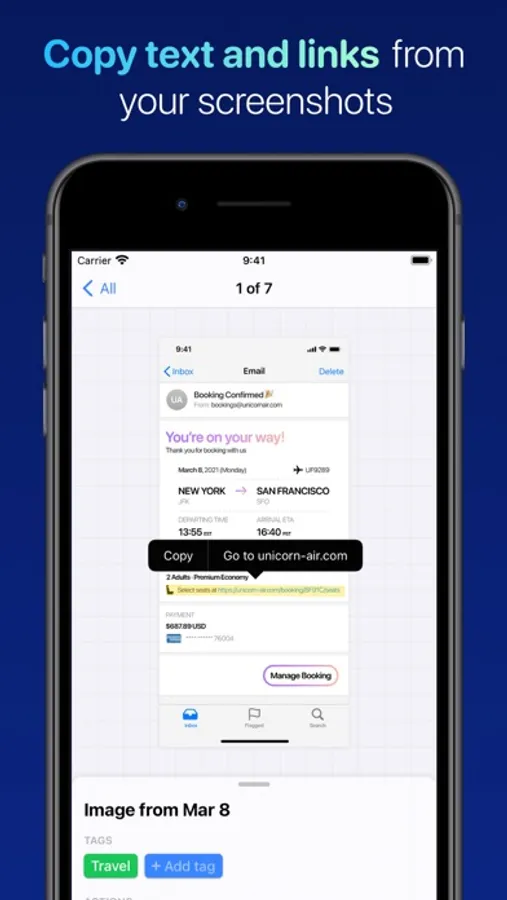 • Copy text from your screenshots. Just tap on any text within your screenshots to copy text and open URLs