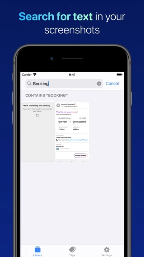 • Find specific screenshots in your library by searching for text. FlyScreen indexes your screenshots ahead of time to make searching super fast!