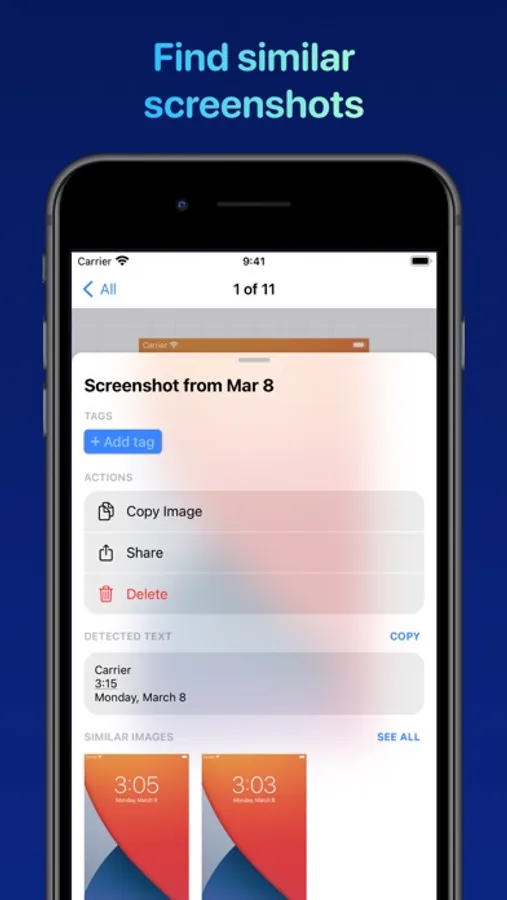 • Find visually similar screenshots, making it easy to identify and delete duplicates