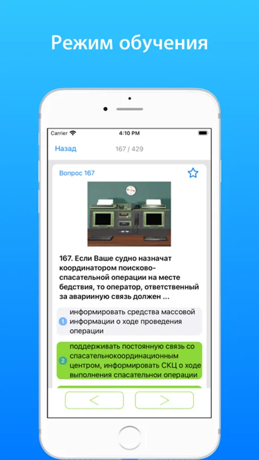 • Режим подготовка - Позволяет изучить вопросы в текстовом формате с отмеченными правильными ответами;