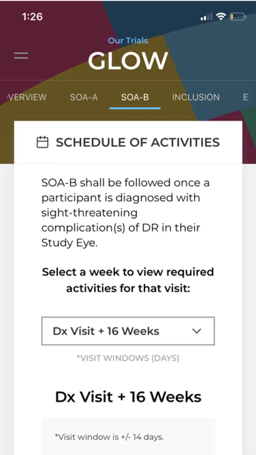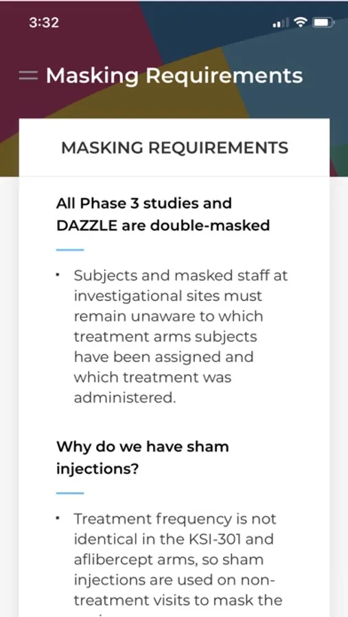 • Key protocol information for the following studies: Phase 1b (wAMD, DME, RVO), DAZZLE (wAMD), GLEAM and GLIMMER (DME), BEACON (RVO), DAYLIGHT (wAMD), and GLOW (NPDR).