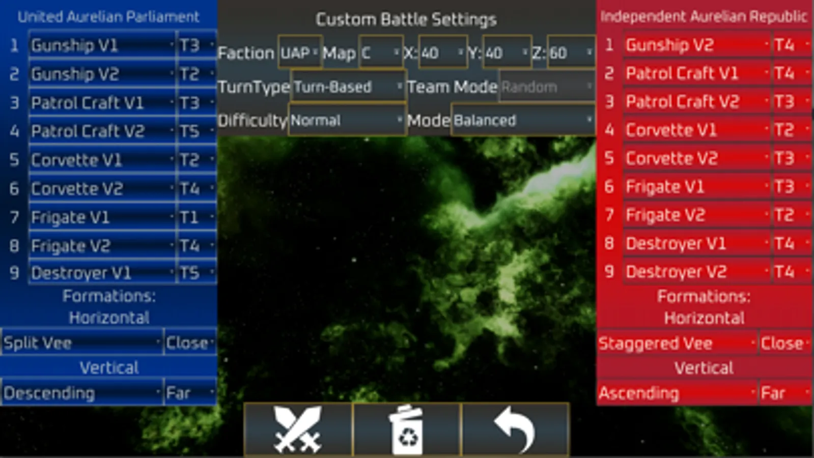 Includes a custom battle mode to configure user created battles with full customization of a fleet battle simulator. Enjoy a vast variety of configurations to create your own 9v9 battle simulation. Chose from 19 different battle deployment settings that include: Random, Head-2-Head, Chase/Chased, Back-2-Back, 2x Parallels, 4x Flanks, 8x Obliques with advantageous and disadvantaged positions.