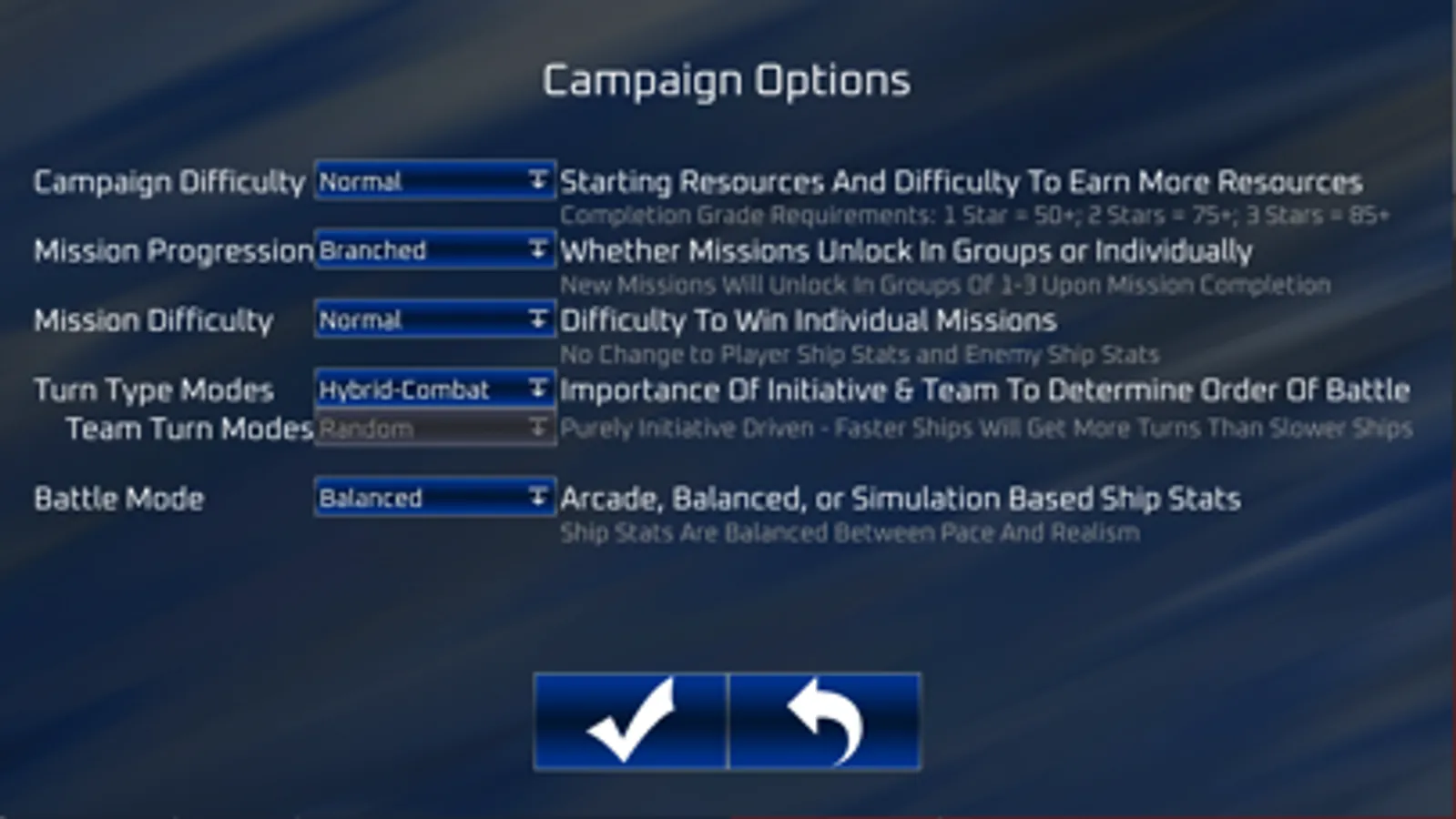 Supports 3 different major game modes (Hybrid-Combat, Turn-Based, Team Turns). 5 Levels of difficulty for mission and campaign play. Additional campaign and battle customization options include support for Arcade, Balanced, and Simulation modes as well as Basic and Advanced AI. Play modes include Player Vs. AI, Player Vs. Player, and AI Vs. AI.