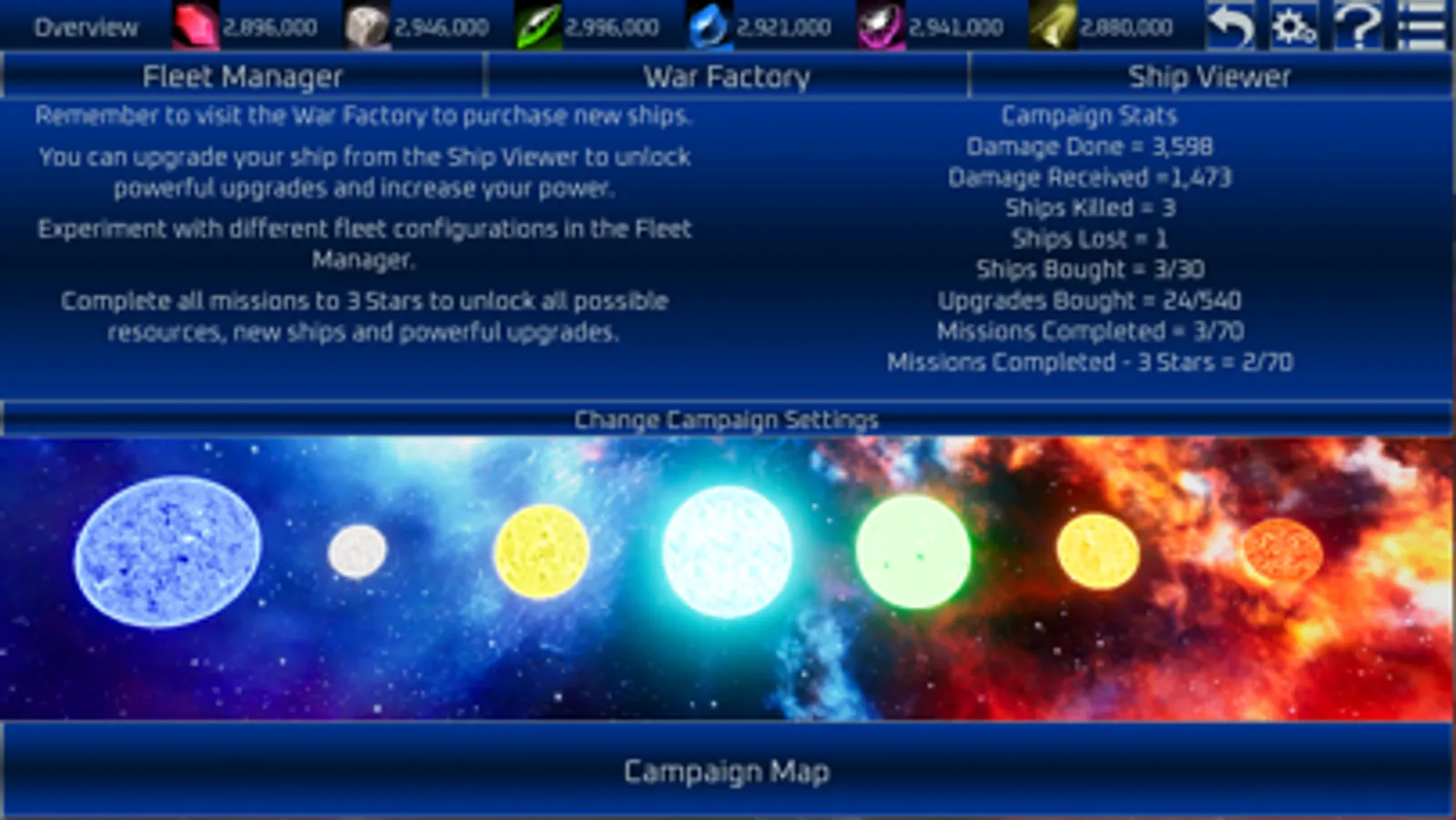 Utilize the Fleet Manager to customize your fleet with hundreds of formation combinations. War Factory to purchase new ships and sell no longer used ships. Ship Viewer to upgrade your ships with over ship specific upgrades.
