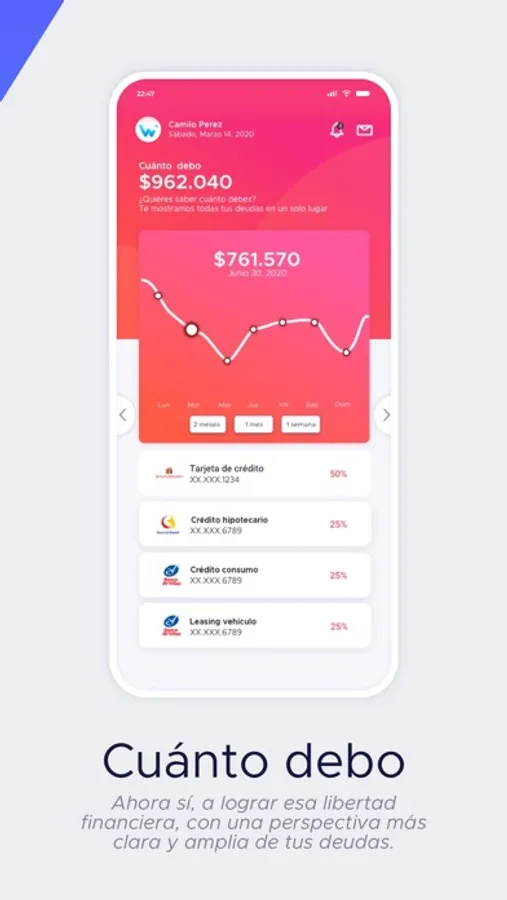 Permite consolidar los saldos de todas las deudas que tengas con los diferentes bancos: Consumo, libranza, hipotecario, leasing habitacional y de vehículo, tarjetas de crédito y cupo rotativo. Esta vista la construye Wioba de manera automática después de agregar los bancos y sus productos.