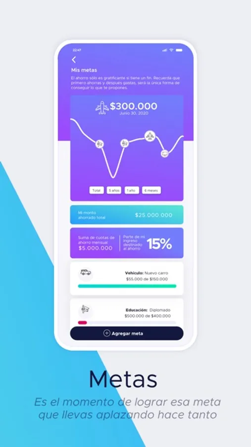 La aplicación muestra las metas de ahorro que te fijes, como están distribuidas en el tiempo y te informará el esfuerzo mensual debes realizar para cumplirlas.