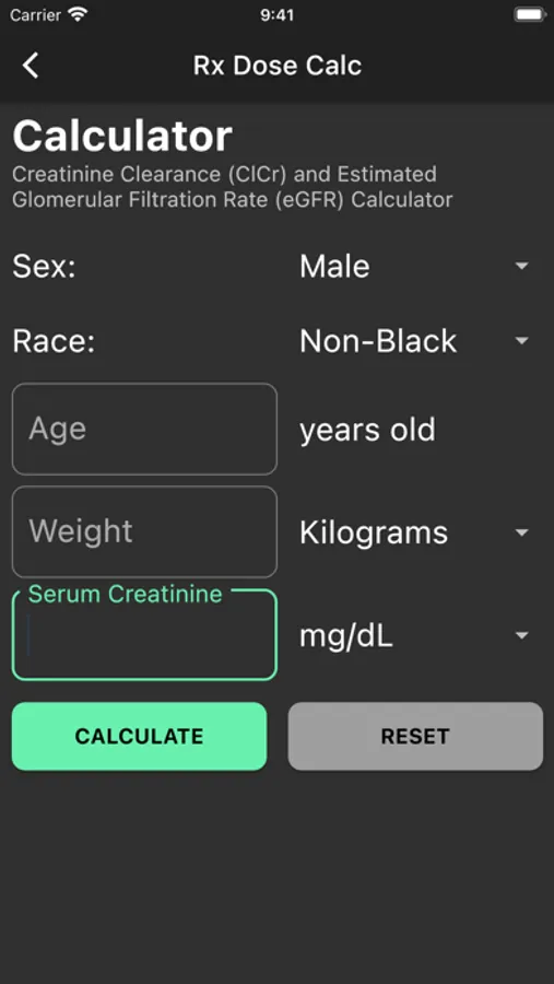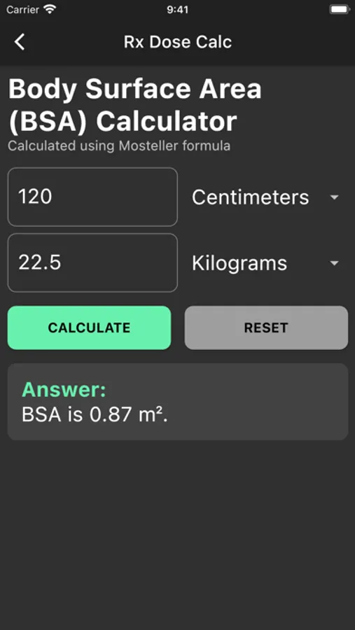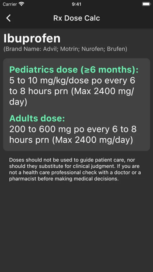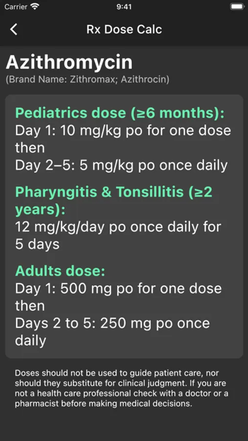 Rx Dose Calc is intended only for health care professionals. Doses should not be used to guide patient care, nor should they substitute for clinical judgment. If you are not a health care professional check with a doctor or a pharmacist before making medical decisions.