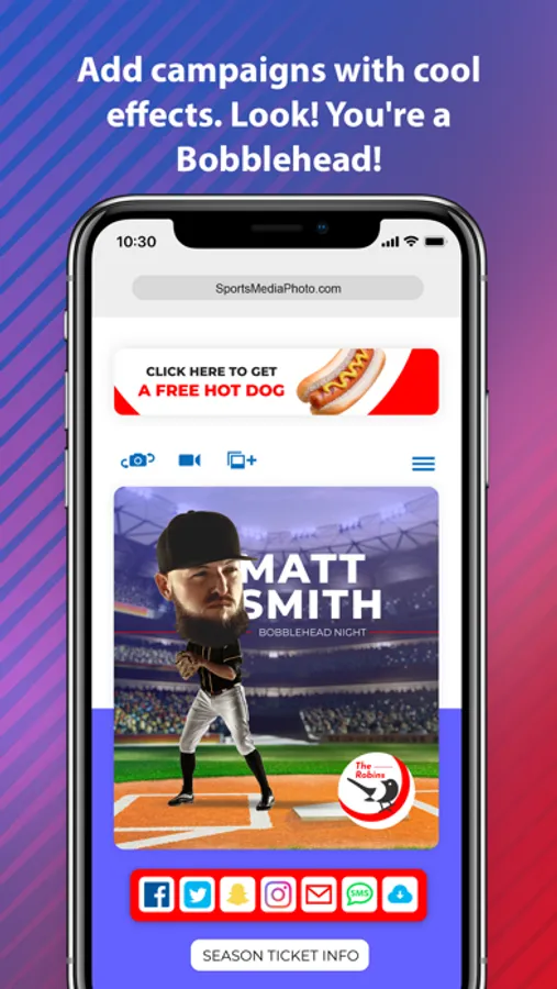 Sports Media Photos is a photo and data capture application that allows sports fans and sports venue guests to commemorate visits and celebrate their team with photo filters, photo contests and photos with graphic overlays.