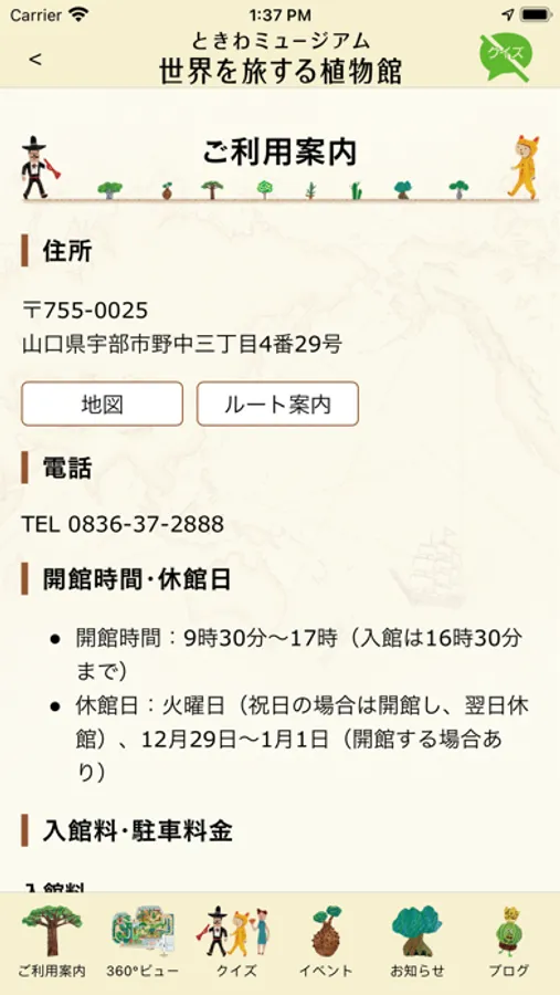ときわミュージアム世界を旅する植物館の所在地や連絡先、開館日、入館料、駐車料金などの基本的な情報を見ることができます。(※開館日はときわ公園ホームページや、アプリ内のお知らせ情報なども合わせてご確認ください。)