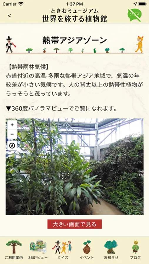 館内マップから見たいゾーンを選んでタップすると、ゾーンごとの360°パノラマビューや、代表的な植物の紹介を見ることができます。