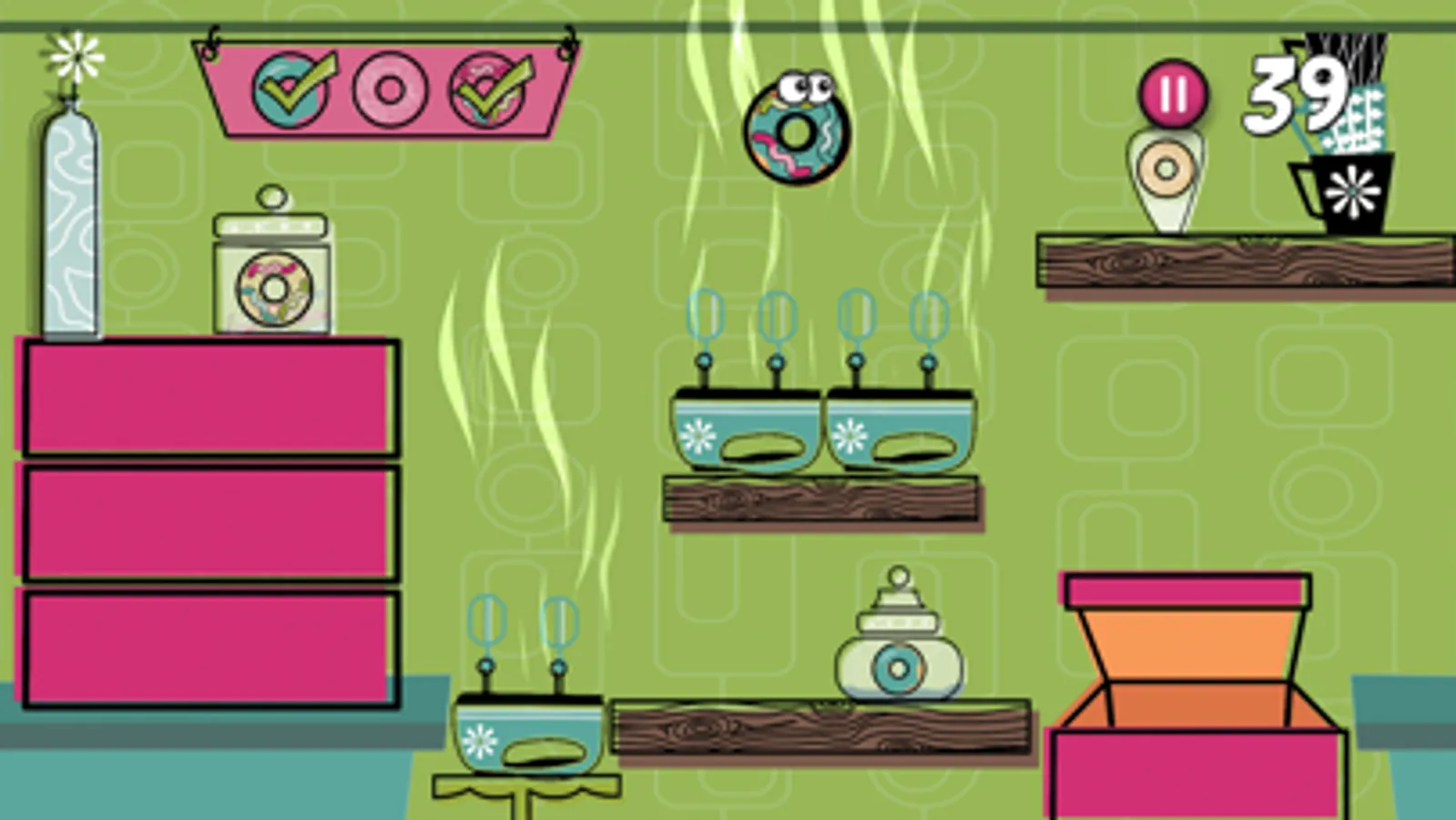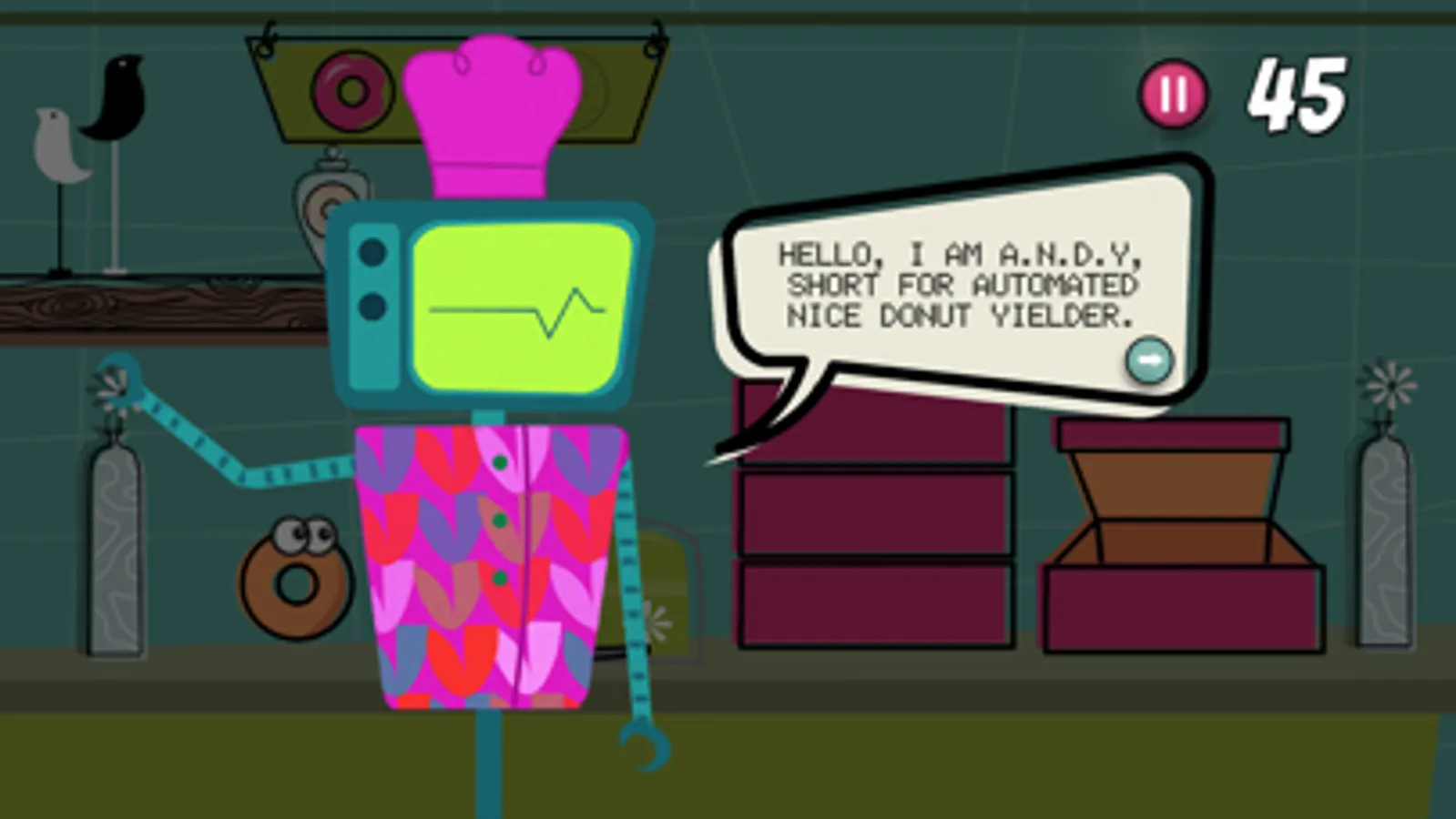 A.N.D.Y has been serving his community for decades by making the most delicious donuts in the valley. But A.N.D.Y is getting old...his gears and voice box aren't what they used to be. As he looks towards retirement, A.N.D.Y has found a way to automate the donut making process! However there are still a few kinks to work out. Can you help him reach his goal!?