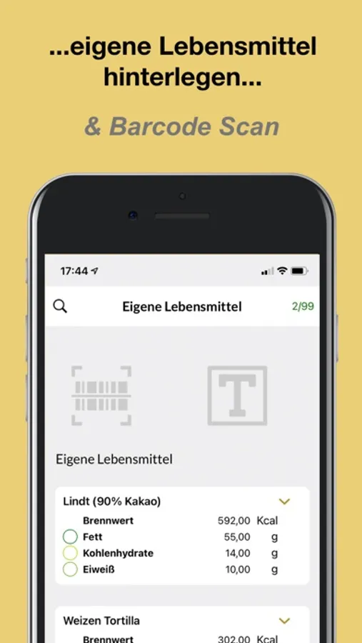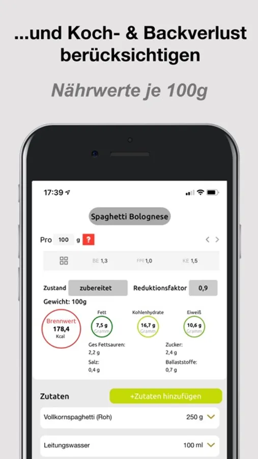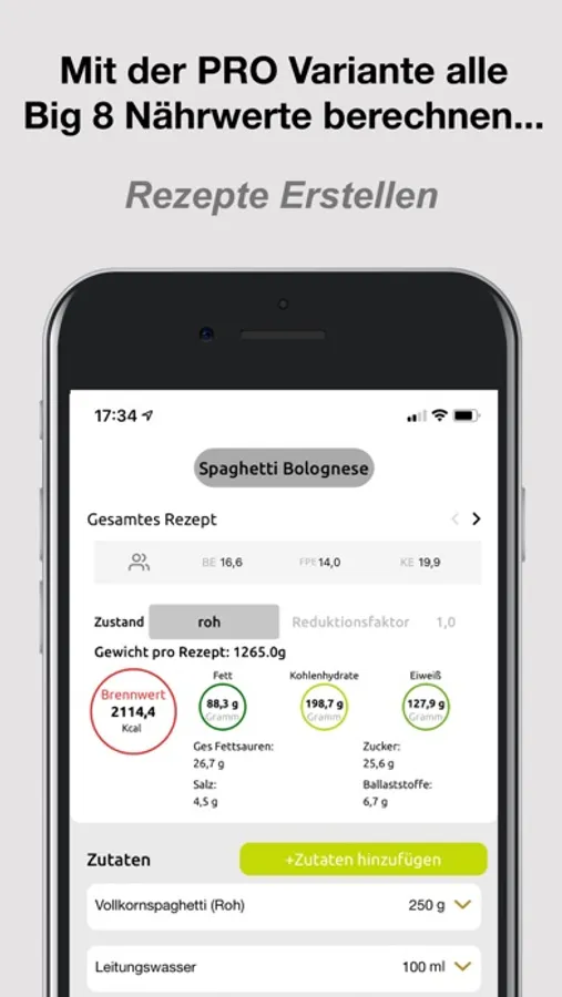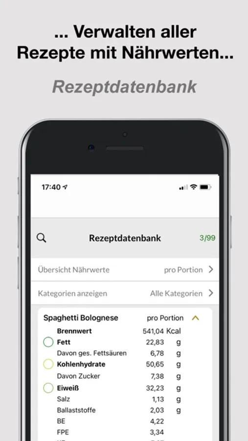 Zudem können auch Diabetiker relevant Werte berechnet werden wie beispielsweise: BE, KE und FPE