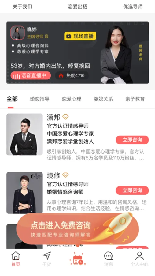 不论是脱单恋爱、分手挽回、婚姻矛盾、婚外感情、恋爱聊天话术、婚介矛盾、相亲困扰、离异困扰、解压倾诉以及感情修复等等你所有的情感难题,在这里都能得到解答! 无论你喜欢上花田珍爱花镇松果听芝小鹿算爱还是百合,这里都是你的家!情感咨询狮专区:【情商提升】教您如何提升自身魅力,修炼情商,成为情场高手; 【海量干货】每天情感干货直播,专业情感大师解答疑惑,给你专业情感指南; 【婚恋指导】感情大师教你分辨真假分手,快速表白,成功挽回情感;【婚姻调解】情感大师教你调解婚姻矛盾,击退第三者,解除危机,改善夫妻关系;