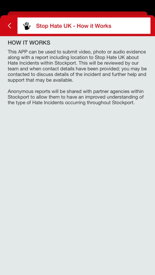 This APP can be used to submit either video, photo or audio evidence along with a report including location to Stop Hate UK about Hate Incidents within Stockport. This will be reviewed by our team and where contact details have been provided; you may be contacted to discuss details of the incident and further help and support that is available.