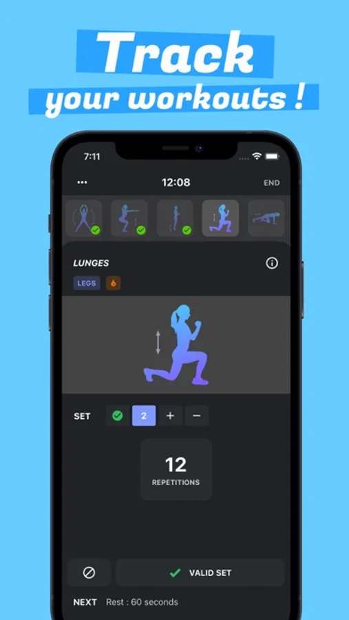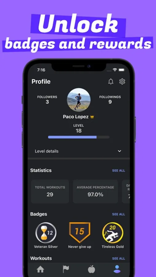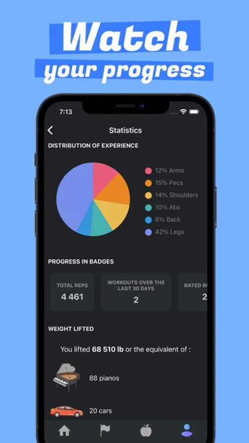 To do this, you'll progress through your workouts by earning experience points and leveling up in six different muscle groups : arms, chest, shoulders, abs, back, and legs. Fitness and bodybuilding being above all sports promoting records and surpassing oneself, you will unlock badges and titles according to your exploits during your training sessions, in order to encourage you to keep going.