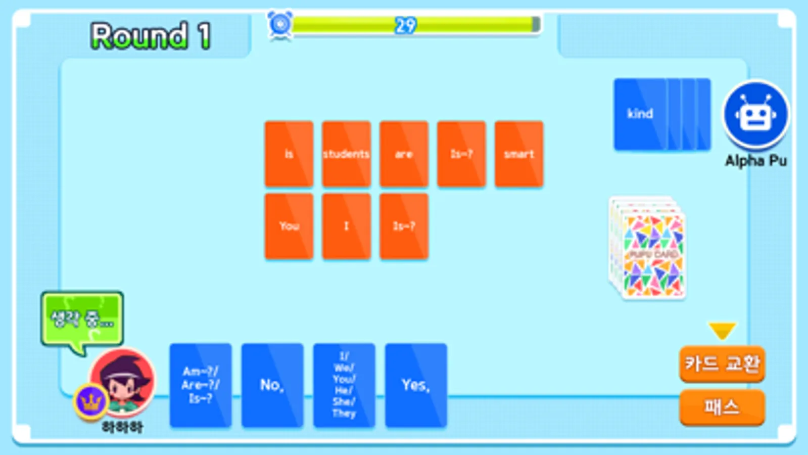 Pupucard, English Grammar Master, consists of 25 chapters which include basic English grammar from chap.1 be-verb, chap. 9 comparative to chap. 25 If-clause. It is published as three languages: Korean, English and Japanese. Children can play a game not only with AI but also with other players up to 4. They can master English grammar by simply playing games which help them memorize English sentences automatically. Proven learning effect is that it makes your score double in a test in 30 minutes.