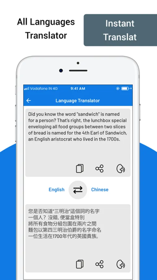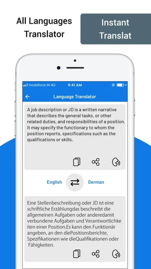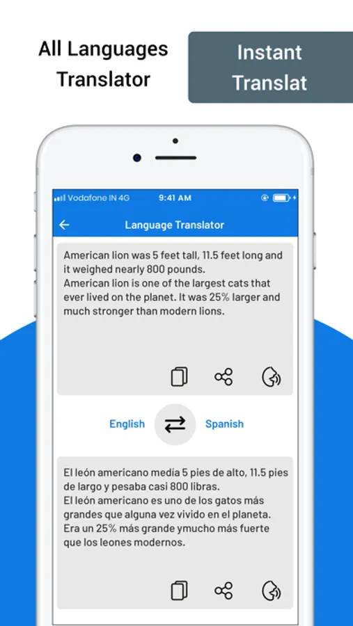 By using Language translator, Free Translation Voice & Text app you can also share your translated words with your friends on any social media.