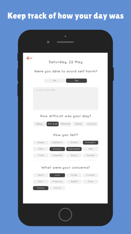 Calm Urge is the perfect app to help you resist the urge to self-harm. With a range of activities and tools, you can keep track of your emotions and worries, and develop new coping mechanisms to help you stay calm and in control.