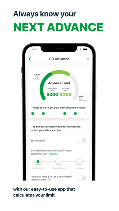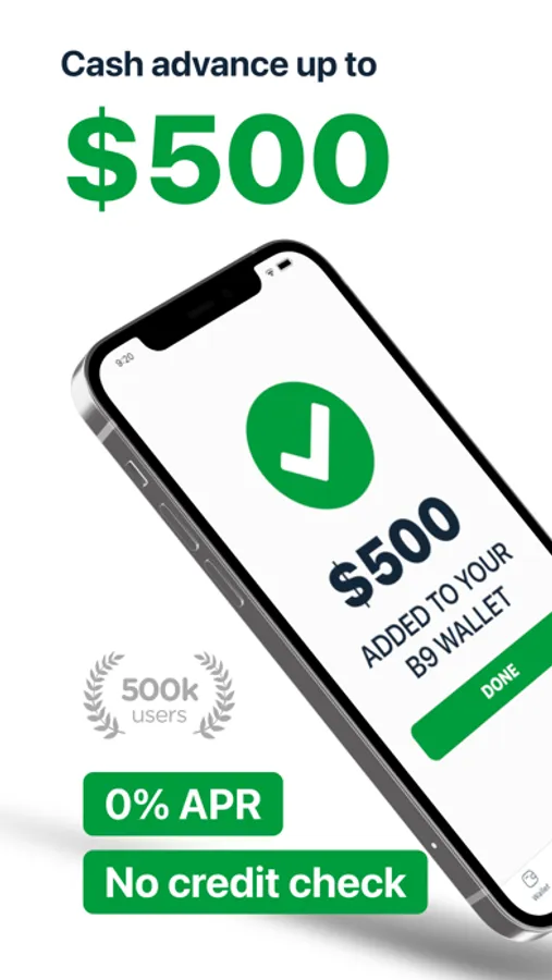 B9 advance is an optional service offered to anyone who has B9 checking account in good standing. B9 members can get up to $500 of their pay per one payment cycle. This service has no mandatory fees and only requires members to set up a recurring direct deposit to their B9 checking account. Advance limit may change at any time, at B9's discretion. See Terms of Services or contact B9 via support@bnine.com for additional terms, conditions, and eligibility requirements. May not be available in all states.