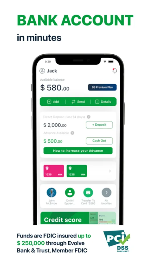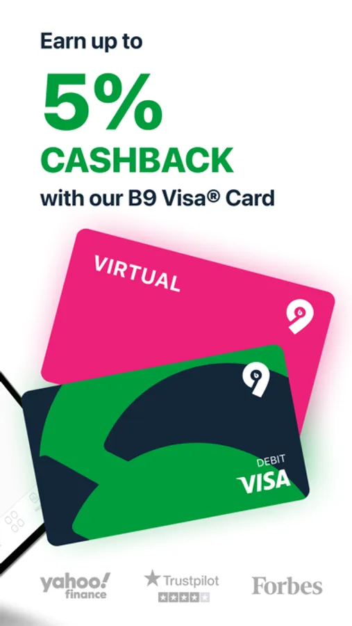 B9 is not a bank. Banking services provided by, and the B9 Visa® Debit Card is issued by Evolve Bank & Trust, Member FDIC, pursuant to a license from Visa U.S.A. Inc.
