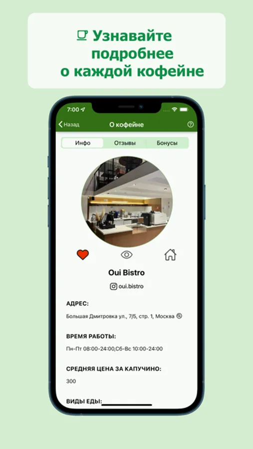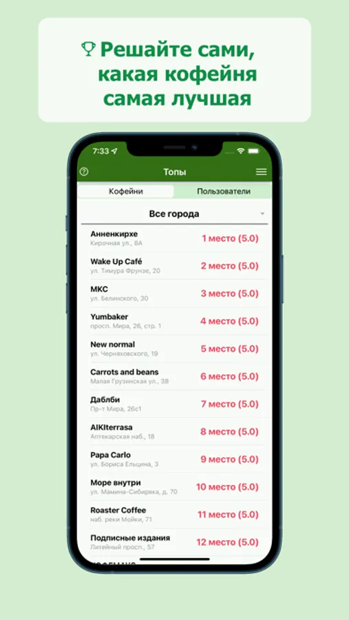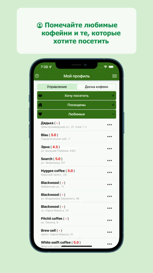 Сохраняйте любимые кофейни и отмечайте те, которые хотите посетить. Оставляйте свои оценки и отзывы, которые помогут другим кофеманам.