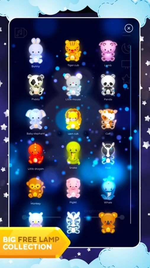 A large number of beautiful nightlights are available in the application. Cute animals will delight your little one, help to fall asleep faster and have good dreams. Several beautiful, animated backgrounds are available. Adjust the brightness and color of the application so that the baby is comfortable.