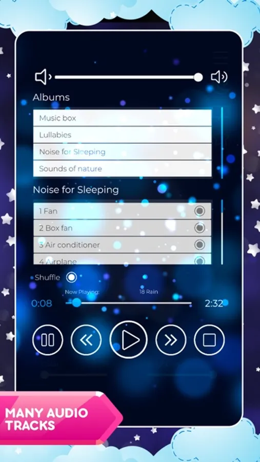 There are 4 sections available: music box, baby lullabies, white noise for sleeping, instrumental music.