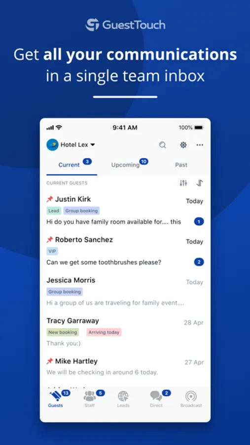 GuestTouch Messaging is the ultimate guest messaging platform for modern hoteliers. It helps you connect with your guests and send automated messages at all stages of their stay journey, from booking, pre-arrival to in-stay and post-stay via channels like SMS and WhatsApp while managing it all communication in a single inbox.