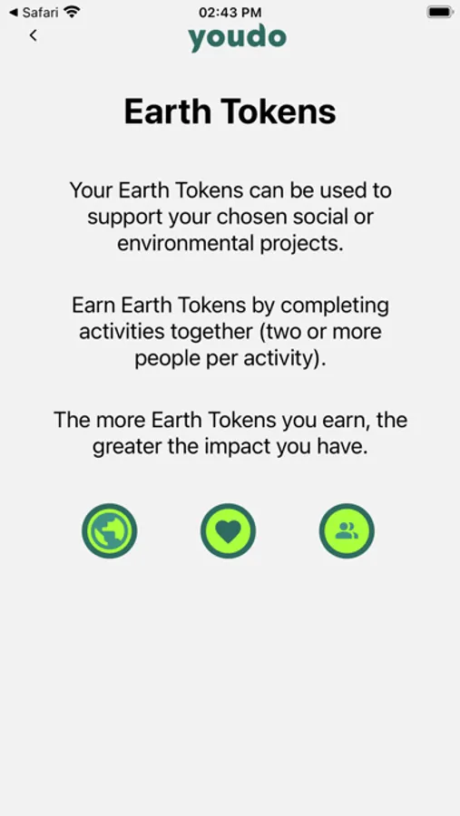 Every activity completed by two or more people generates a ‘youdo Earth Token’ which is worth £1. ‘Earth Tokens’ can be redeemed as a donation to Environmental or Social impact projects, as chosen by youdo's customers. Customers can choose to support their own projects or use youdo’s own project portfolio (reforestation in Madagascar and marine conservation globally). 10% of youdo’s annual licence fees goes towards funding our customers Earth Tokens.