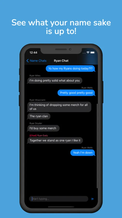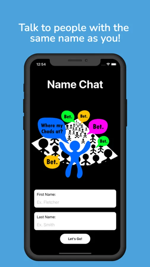Name Chat is THE premier place to find all the people in the world with your name. Gone are the days of looking yourself up on Instagram and sending follow requests to people who never follow you back, with Name Chat you can talk directly to these people and show them that you are the alpha.