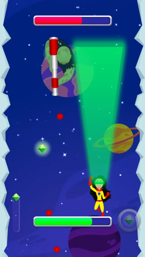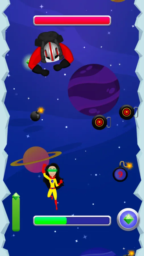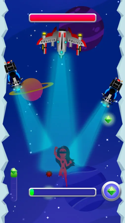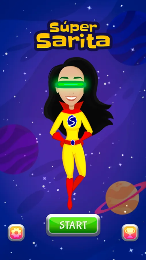 Travel with Super Sarita through her galaxy! Defeat space spiders, zombie gangsters, rebel fighters, and galaxy police to earn neutron stars (points), while avoiding comets, black holes, and space junk. Sarita has the ability to fire a laser beam from her eyes, fly at super speed, and enclose herself in a forcefield. These abilities must be earned, however, throughout the game. At times, Sarita will enter galaxy portals and enemy bosses will appear. Sarita must use all her strength to stay alive, defeat the bosses, and continue her journey.