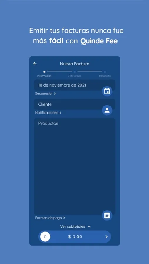 Factura electrónicamente desde nuestra app Quinde Fee, conforme a la normativa vigente del SRI, desde cualquier dispositivo móvil. Además, visualiza tus reportes de los comprobantes emitidos en cualquier momento y lugar.