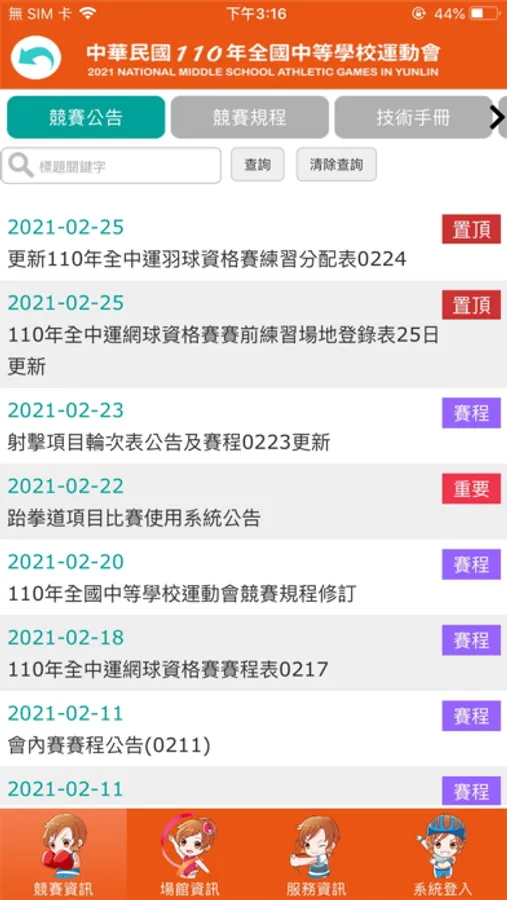 舉辦項目:田徑、游泳、體操、桌球、羽球、網球、跆拳道、柔道、舉重、射箭 、軟式網球、空手道、射擊、拳擊、角力、自由車、木球、輕艇、擊劍、划船 、滑輪溜冰(競速)