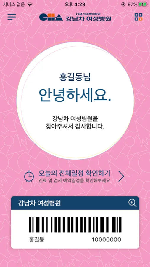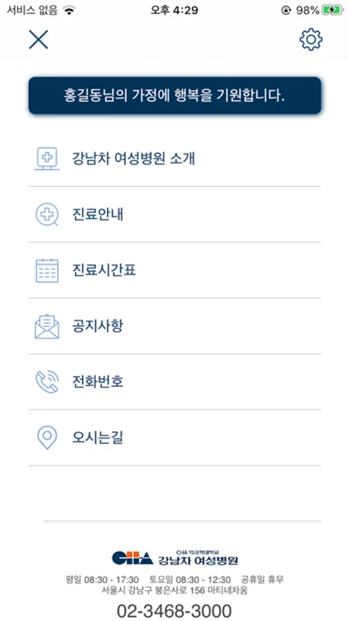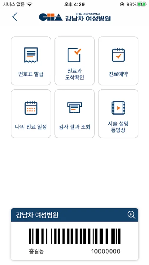 본 App은 '강남차 여성병원'에서 사용되는 App으로서 모바일 번호표 발권, 모바일 도착확인, 모바일 진료카드, 모바일 진료일정안내 등의 기능을 포함하고 있습니다.