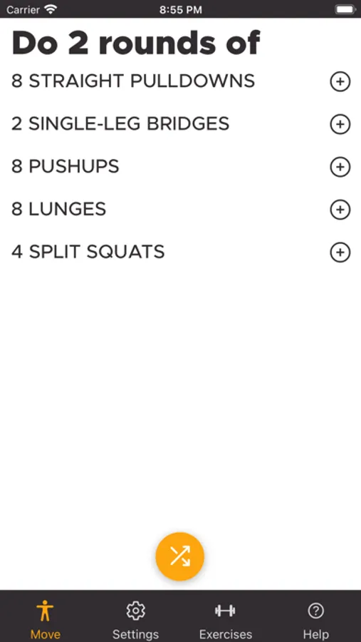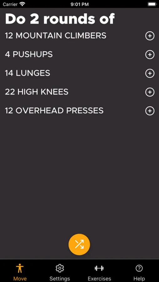 Move Mo is a random workout generator. Random means no thought, no planning, and no time required to create a workout. Press one button and perform the exercises. That's it.