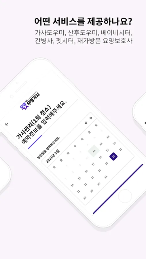 가사도우미, 산후도우미, 베이비시터, 간병사, 펫시터, 재가방문 요양보호사를 신청할 수 있는 우렁각시 플랫폼 APP입니다.