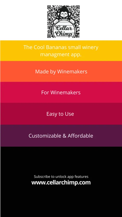 The Cool Bananas winemaking management App for small-ish wineries. Made by Winemakers. For Winemakers. Cellar Chimp needs an active subscription to access winery account. To subscribe please visit www.cellarchimp.com