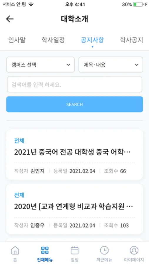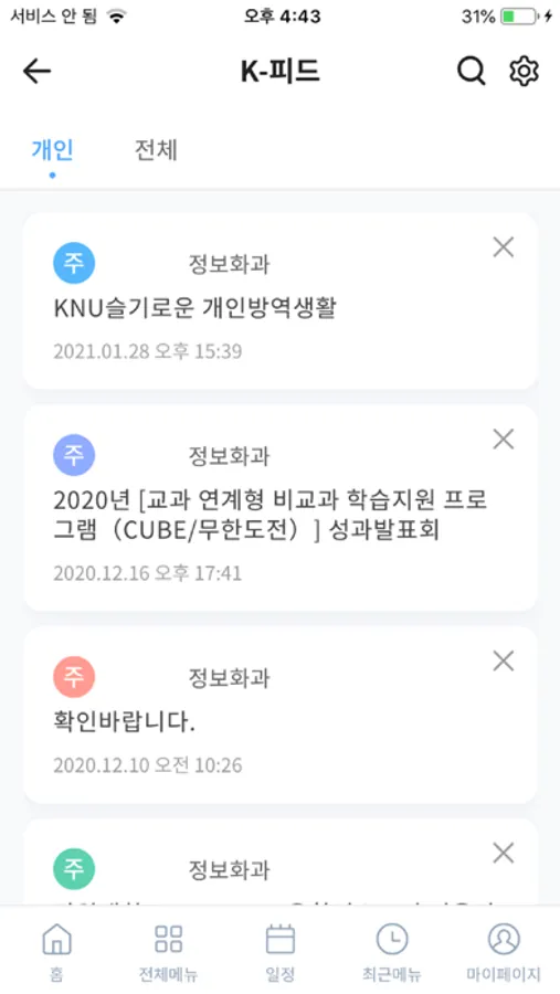 - 학사/장학공지, 학교정책, 강의일정 변경, 경조사 등 개인별 소식 제공