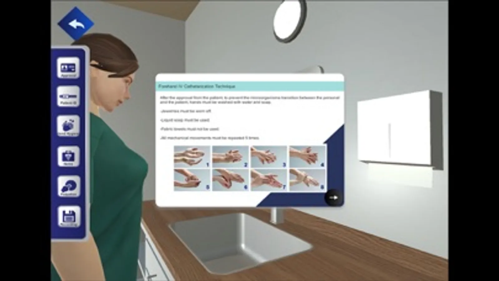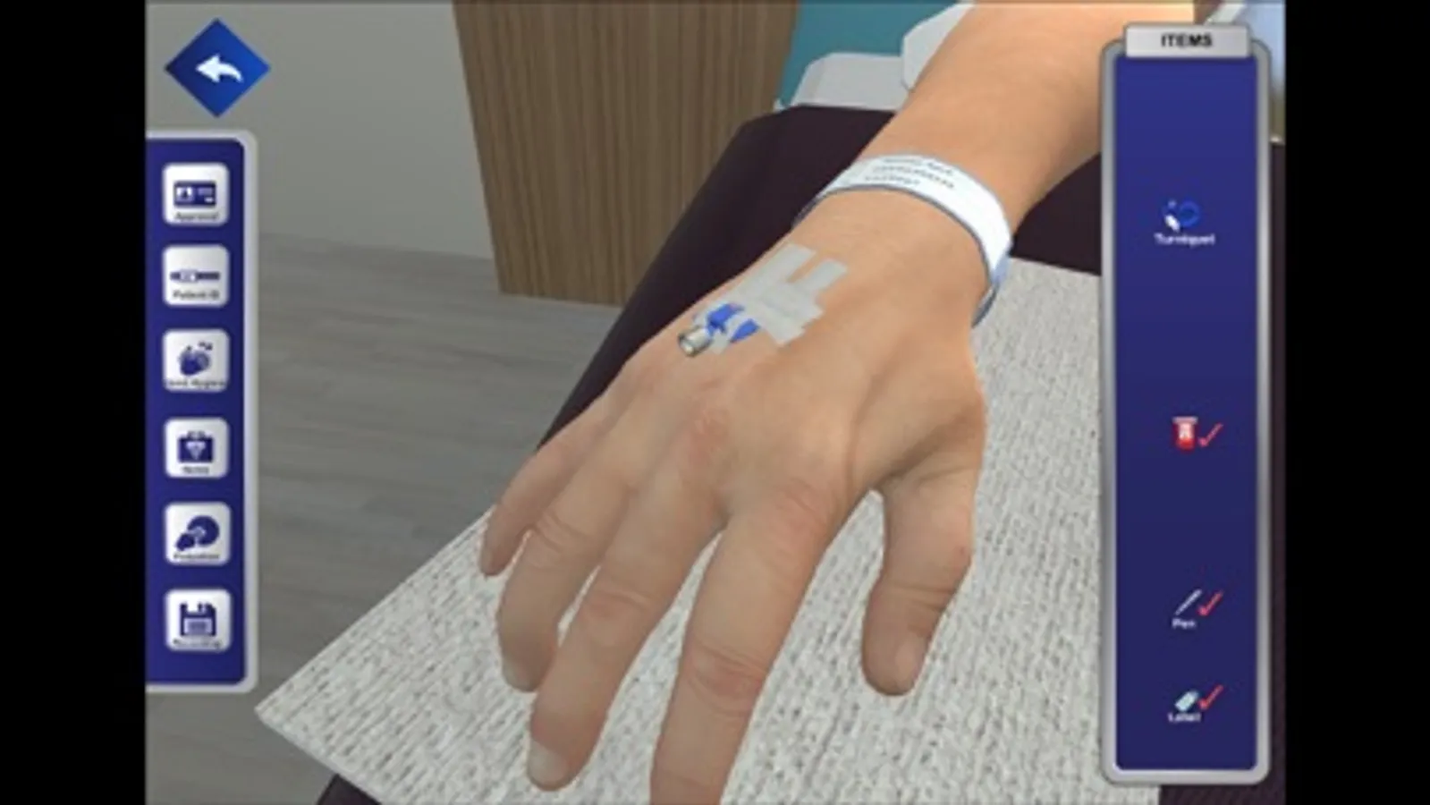 Forehand intravenous catheterization interactive serious game. Both step by step training as well as self test modules.